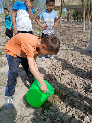 ウズベキスタン・カラカルパクスタン共和国の首都ヌクスにあるこの学校は、2024年から「子供の森」計画に参加。初めての植林活動では、地元で長く愛され、花が美しく、乾燥や寒さにも強いリンゴ、アンズ、カリンといった果樹を植えました。高校2年生のタルガドゥさんは「小さな頃からおじいさんと一緒に木を植えてきました。今日は友だちと植えることができ、楽しかったです。木は酸素を生み、景色を変え、周りの人々も助けられます。植林の大切さを小さい子どもたちにも伝えていきたいです」と話してくれました。今後は、環境学習などを取り入れて活動を広げていく予定です。